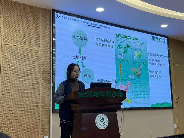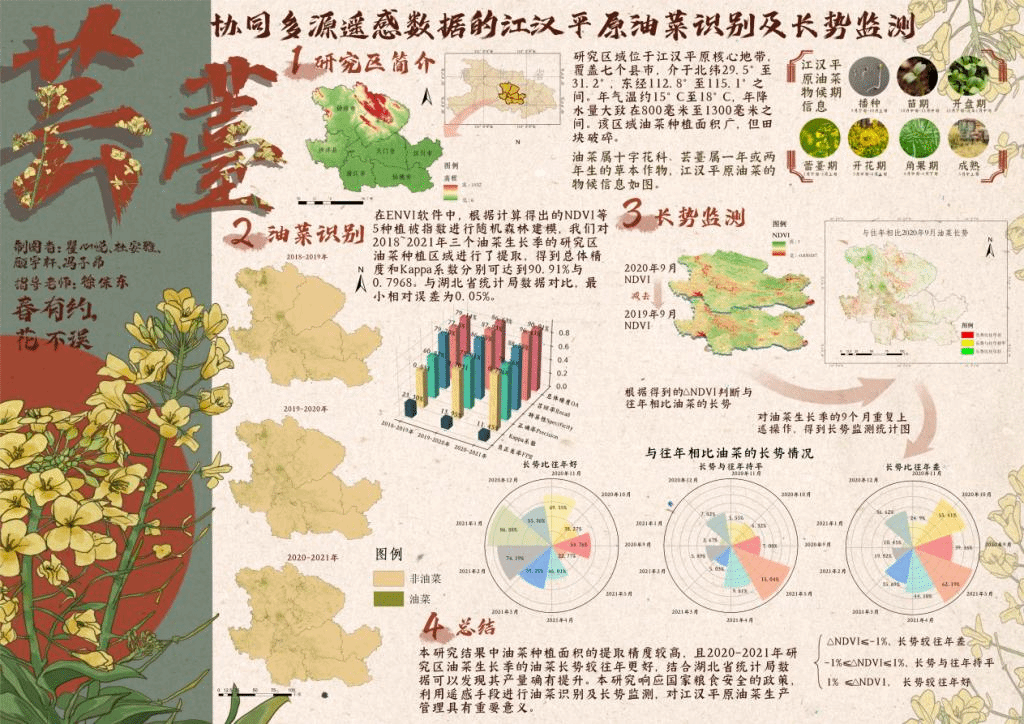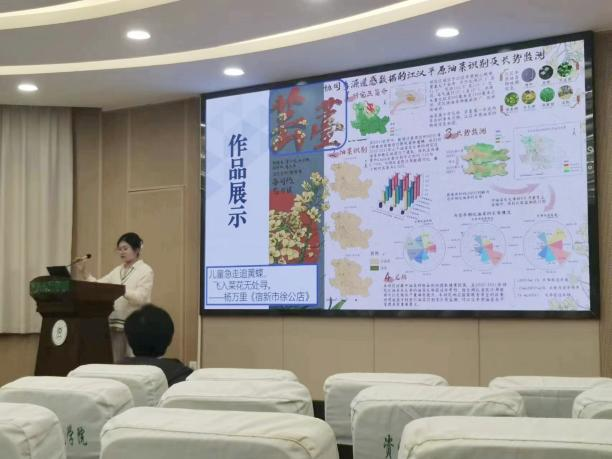经过激烈角逐,评选出了优秀作品并颁发奖项。其中“多感交织,“智”愈家园——从多元感知角度探寻影响武汉市街道愉悦度因素”荣获一等奖;“领跑中部崛起,共筑繁荣高峰——武汉城市圈同城化高质量发展”与“协同多源遥感数据的江汉平原油菜识别及长势监测”获得二等奖;“践行大食物观,端好中国饭碗”、“五谷者,万民之命”和“云梦绿洲呼唤清风”获得三等奖。