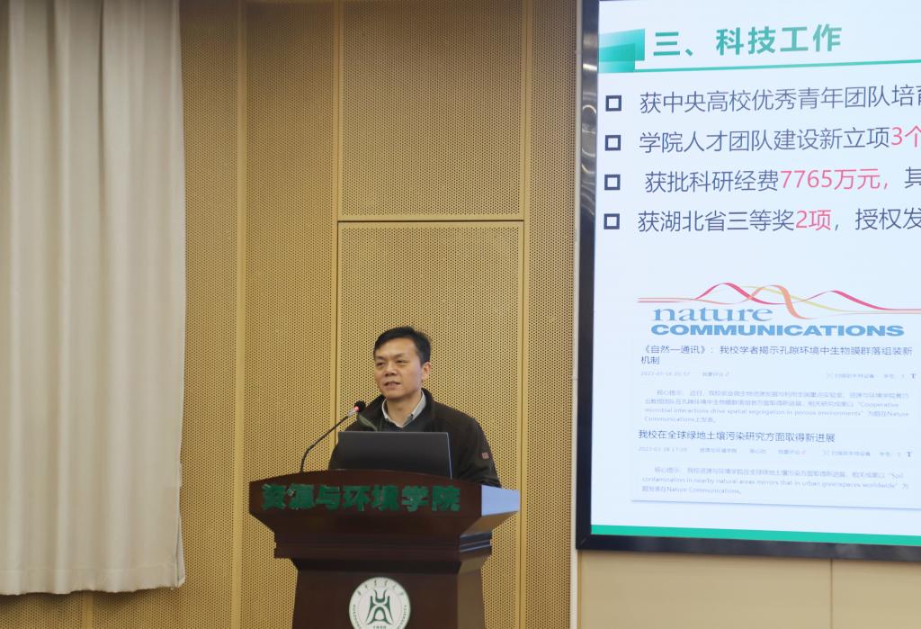校党委常委、副校长郭刚奇代表学校对全院师生过去一年的辛勤付出予以肯定,他谈到,资环学院班子勤奋敬业,求真务实,开拓进取,过去一年取得的成绩是集体力量的汇聚。对学院未来工作他提出四点要求,一是要旗帜鲜明讲政治,要讲政治纪律,讲政治规矩;二是要凝心聚力谋发展,要用发展解决发展中的问题;三是要担当作为求突破,要敢于担当、敢于负责,常规工作要提质增效,改革创新工作要求突破;四是要廉洁自律树形象,加强自我修养和自我约束,以德育人、以德为学。他指出,学院要认真贯彻落实党的二十大精神和落实即将召开的学校第十一次党代会精神,用习近平新时代中国特色社会主义思想武装头脑,指导实践,推动学院事业高质量发展。