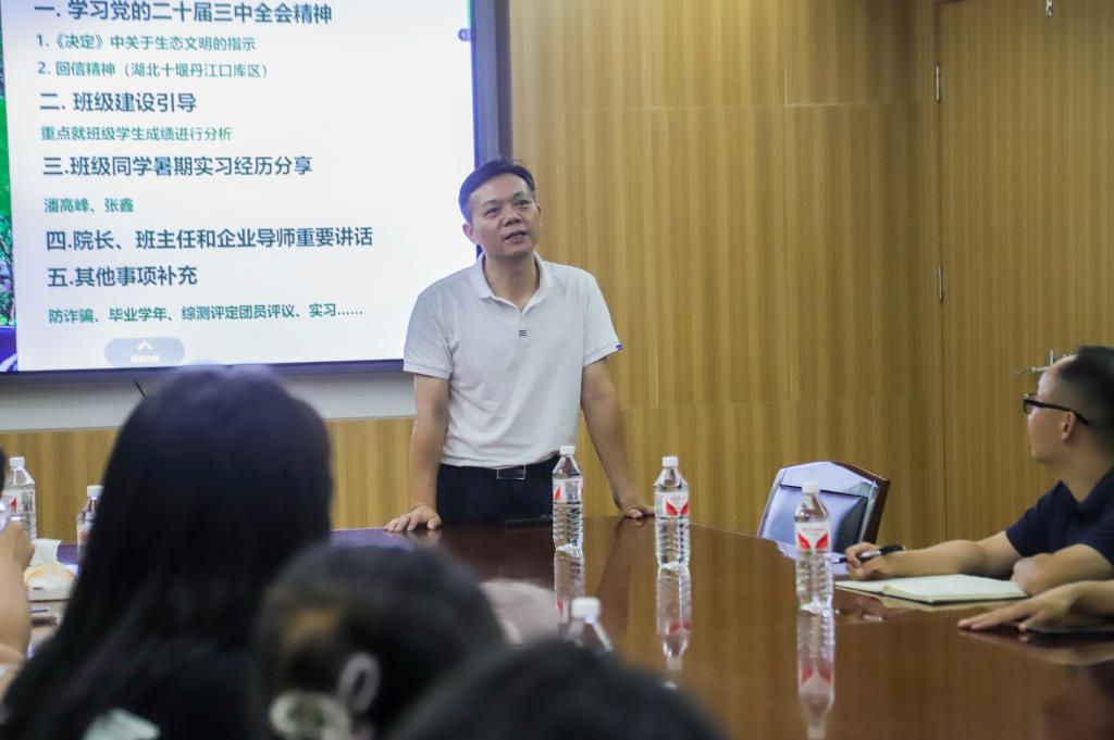 在毕业班级环工2101班,院长谭文峰关心学生考研、就业准备情况,鼓励学生关注国家发展,顺应时代潮流,提前做好选择,做到心里有数。其次,合理安排复习时间,“把时间精确到每月、每周、每日。”谭文峰强调到。此次开学班会,企业导师戴博文也针对选择直接就业的同学提出建议,并阐述如今的就业形势,强调简历制作的重要性。“无论是考研相关准备,还是行业选择,都可以向老师寻求帮助。”班主任周云补充到。