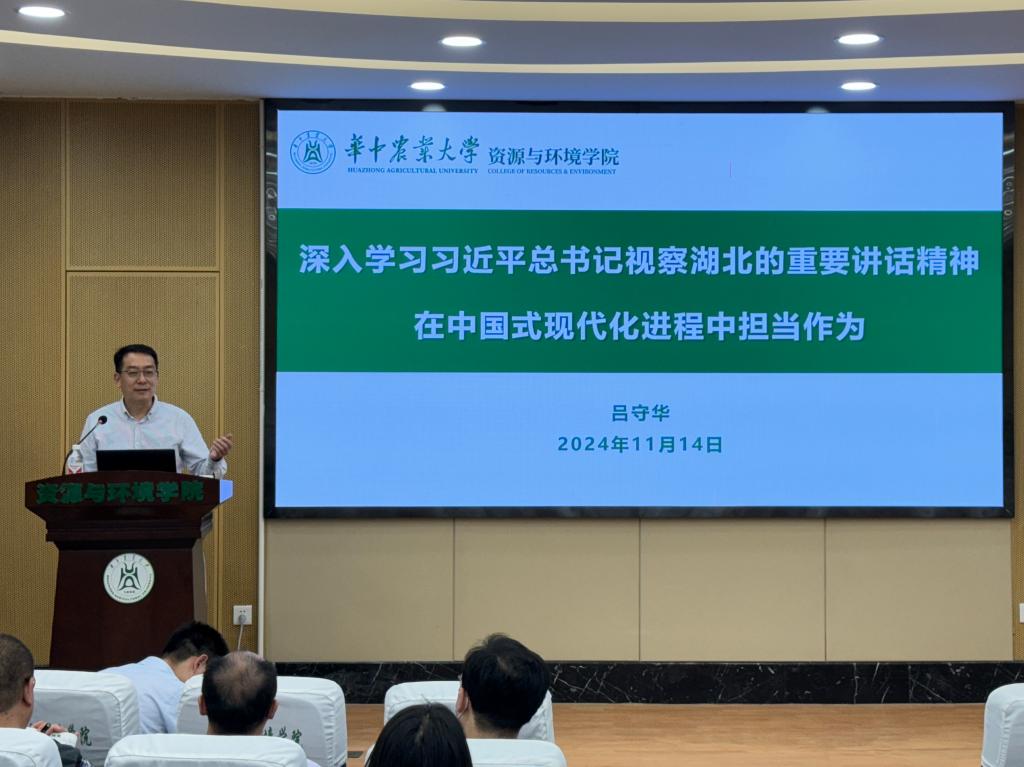 吕守华强调,学院师生员工要深刻学习领会习近平总书记关于在推进科技创新和产业创新上开拓进取、在全面深化改革和扩大高水平开放上勇于探索、在城乡融合发展和乡村全面振兴上奋发有为、在加强文化资源保护和推动文化创新发展上担当使命、紧紧围绕抓改革促发展加强党的建设等五个方面的重要要求,完整准确全面理解和把握习近平总书记重要讲话的重大意义、丰富内涵、精髓要义和实践要求,带着使命学、带着责任学、带着问题学,自觉把思想和行动统一到习近平总书记此次和历次考察湖北时的重要讲话精神上来,同学习贯彻党的二十届三中全会精神、全国教育大会精神结合起来,提振干事创业的精气神,践行造福师生的政绩观,提高善抓发展的真本领,永葆遵规守纪的敬畏心,推动习近平总书记重要讲话精神落地见效,切实把学习成果转化为推动学院事业内涵式高质量发展的工作质效。