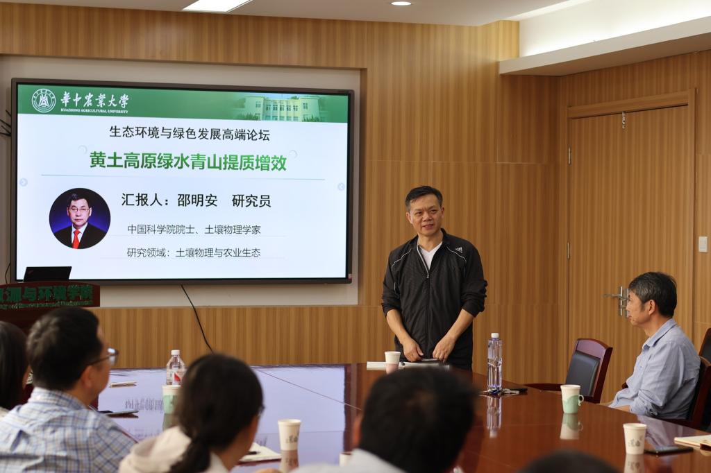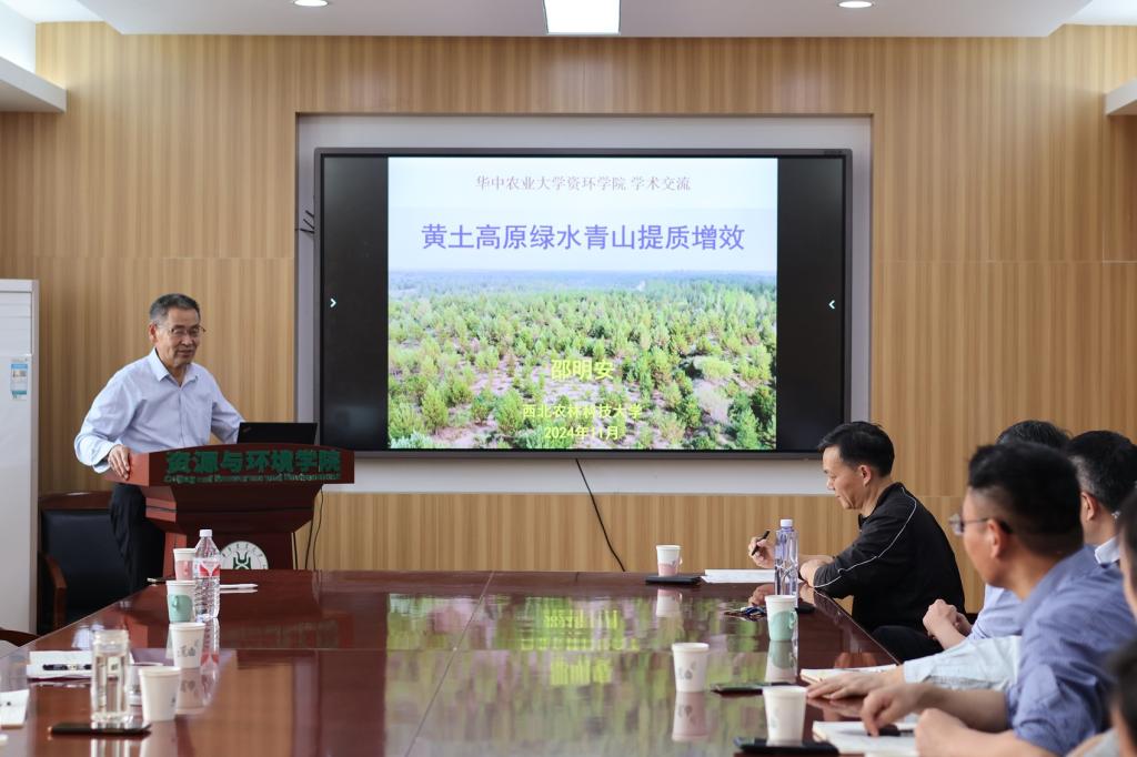 邵明安院士做客学院“生态环境与绿色发展高端论坛”,作题为《黄土高原绿水青山提质增效》的学术报告。他深入剖析黄土高原地区生态建设中的复杂挑战,特别是水土流失、土壤干层以及植被耗水等关键问题,并介绍了其团队在提升生态系统质量和实现水资源高效利用方面的创新技术及成功经验。