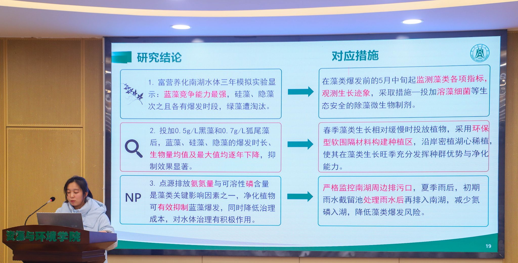“一种活性炭生物膜法处理洗浴废水的系统设计”团队运用连通器原理控制浸没的水量,搭建出了简易的反应系统,使废水处理的过程具象化;基于买球赛的app官网生态浮床治理南湖水质已有的技术基础,“反硝化聚磷菌与生态浮床结合治理南湖富营养化”小组结合反硝化聚磷菌的调查和分析,提出了一种能够提高生态浮床对富营养化水体中磷元素去除效率的措施,以更好治理南湖的水体富营养化;“基于海绵城市理念下的宿舍区雨水综合治理”小组则观察并联系生活中雨水大量滞留的现象,通过深入探究和调查,设计出了荟园宿舍区一套单独的雨水处理系统,以此来应对暴雨时雨水难以及时快速排出的问题。