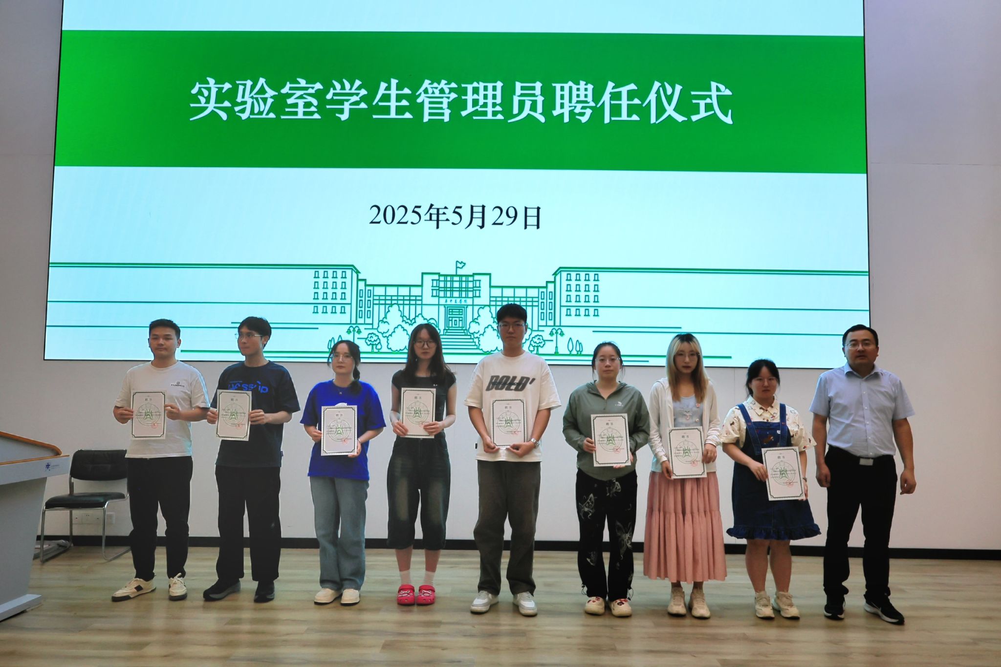 王昭为实验室安全学生管理员颁发聘书。他表示,一纸聘书,既是信任,更是责任。希望大家作为实验室安全的重要“前哨”力量,在日常学习科研中积极发挥朋辈监督、宣传引导与信息桥梁作用,进一步织密校园实验室安全管理网络。