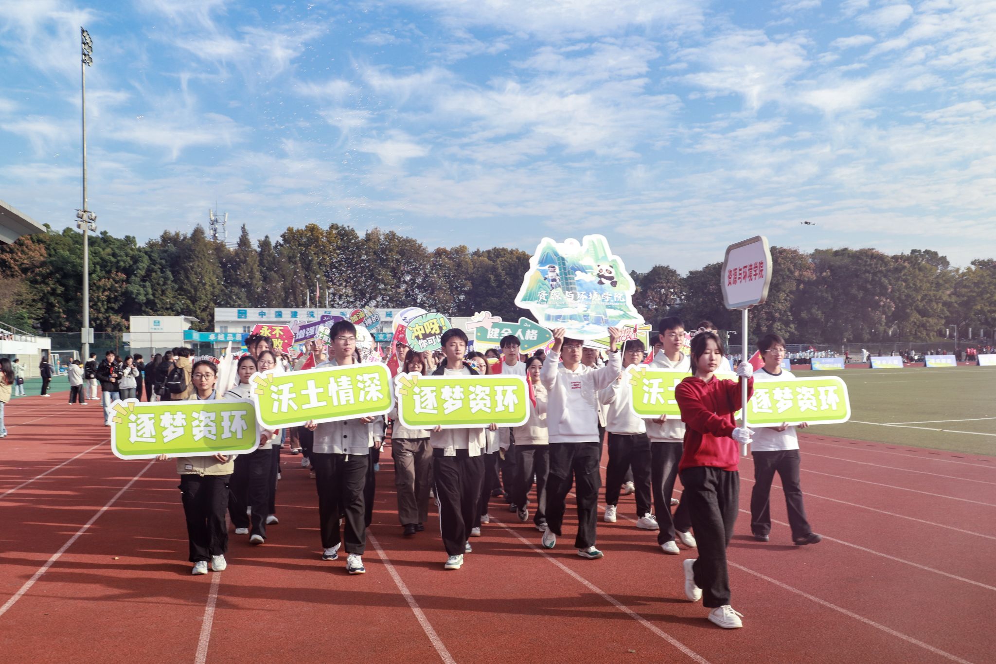 随后,在激昂的背景音乐中,我院运动员方阵昂首阔步向主席台走来。方阵中,部分同学挥舞着鲜艳的五星红旗,红色旗帜在阳光下猎猎翻飞,传递着对祖国的赤诚热爱;另有同学高举“资环逐梦”口号牌,黑色字体遒劲有力,凝聚着资环人奋勇拼搏、追逐梦想的坚定信念。
