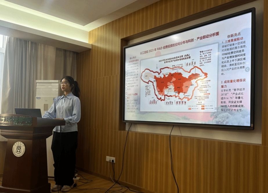 竞赛开幕式上,资源与环境学院党委副书记熊海林致辞。他在讲话中不仅展望了地理信息科学专业的发展前景,也鼓励参赛学子勇于探索。本次竞赛共有11支队伍同台竞技,各小组依次登台展示参赛作品,从项目背景、技术方法到成果价值进行全面阐述,并回答在场专家与老师的提问,展现出扎实的专业功底。参赛作品主题紧扣行业热点与现实需求,内容丰富多元:既有聚焦生态保护的梯田损毁风险测算,也有服务城市规划的武汉市“三生”空间冲突分析,还有关注生态治理的蚂蚁森林在腾格里沙漠的作用评估等,充分彰显了地信专业学子卓越的制图水平与创新思维。