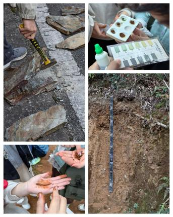 实习准备阶段,11月24日上午召开实习动员大会,从安全和纪律要求到实习进度安排和区域介绍,全方位打牢实习基础。同学们认真阅读实习指南,明确实习的目的、目标及内容,为后续工作做好充分准备。11月24日至28日,自然地理综合实习全面展开。每班分为六个小组,分工协作,共同学习岩石与土壤的知识,深入探索不同区域岩石与土壤的差异特征。 野外现场,大家紧跟讲解、细察岩石纹理,蹲身取土、记录土壤性状。同学们手持地质锤,凿开板岩,亲眼证实其板状构造;细致观察土壤层次,并手搓土壤测质地;滴下pH试剂,耐心等待比色卡比对,每一组数据都凝结着对专业知识的求索。分析环节里,学子们围圈讨论,结合实地观察推导土壤的成土因素与成土过程,总结归纳土壤的分布规律,让课本里的“地带性”“非地带性”有了可触摸的温度。11月29日,实习进入复盘总结阶段。教室里,同学们对照记录梳理数据、分析现象,将野外的观察转化为对地理规律的深层理解,让每一份笔记都成为专业成长的注脚。接下来,学子们将在各位老师的指导下完成实习报告的撰写,系统梳理野外采集的第一手资料,结合课堂理论进行综合分析,进一步提升科研素养与逻辑思维能力。实习虽告一段落,但求知与实践的步履不止。